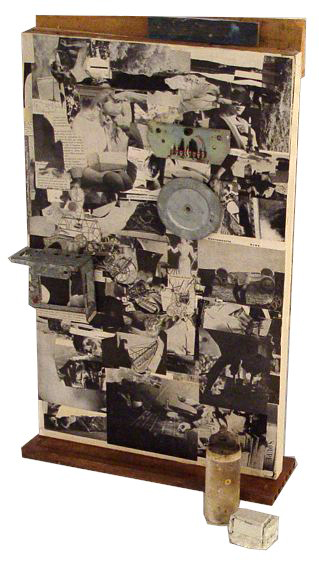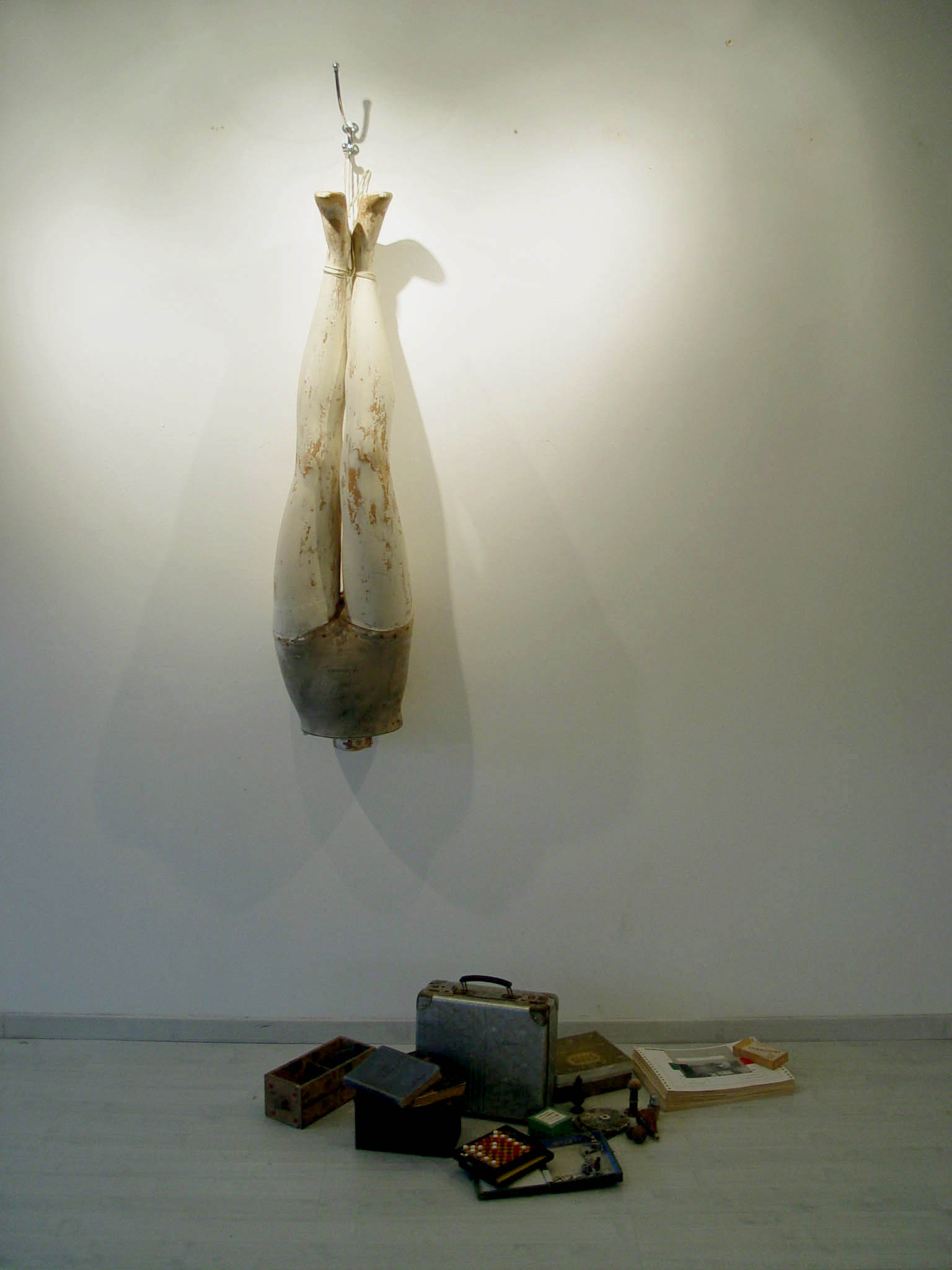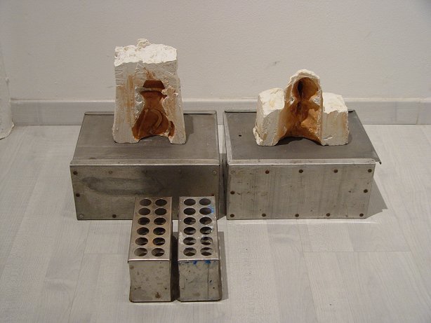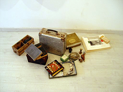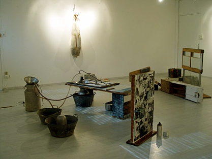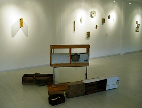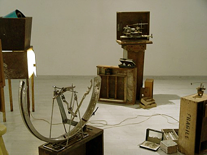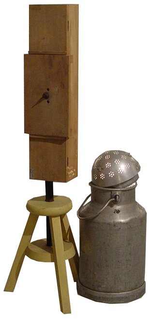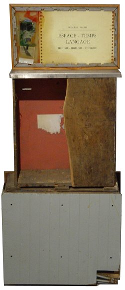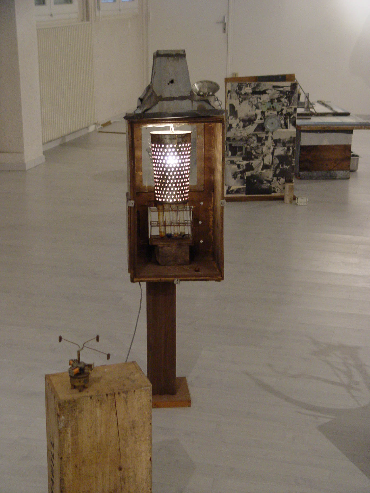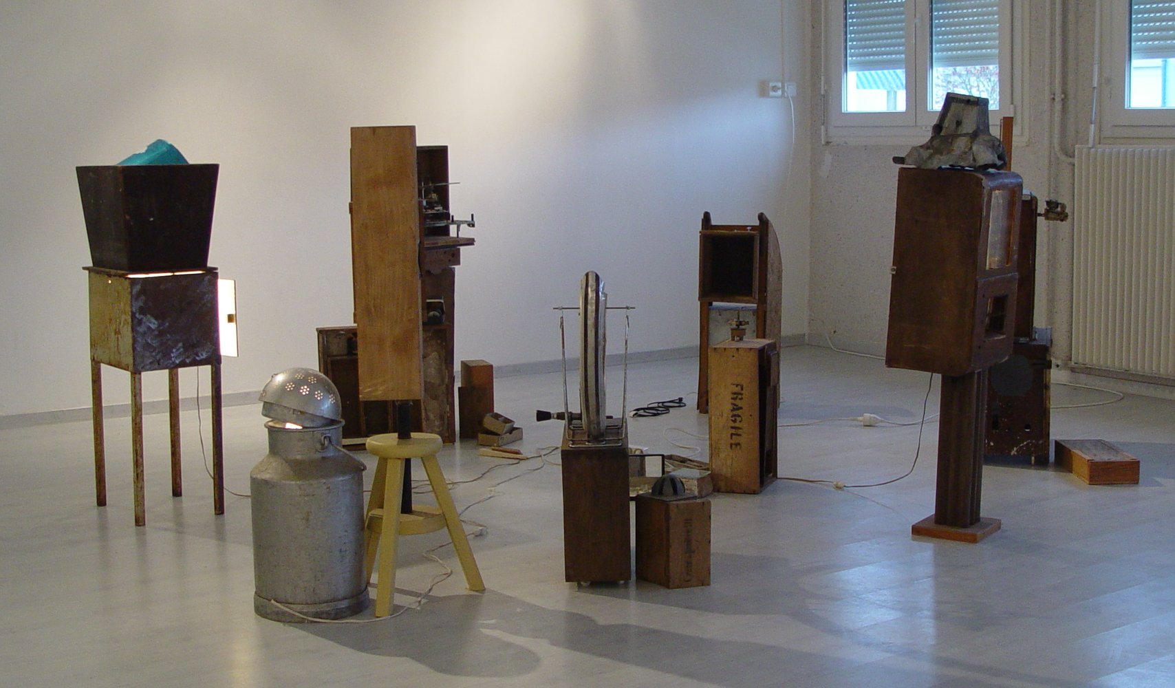 Pour J.P. Pour « la rosée et l’arroseur creusent », il s’agit d’un ensemble non fini de plusieurs objets prenant appui sur l’œuvre de M.D. Ce travail commencé en 87 s’échelonne sur environ 10 ou 15 ans, avec des retours des modifications… des errata désirés. Les objets et mobiliers présentés sont construits à partir de matériaux pauvres : des sortes de bris-collages digne d’un jar dit niais du dit manche. |