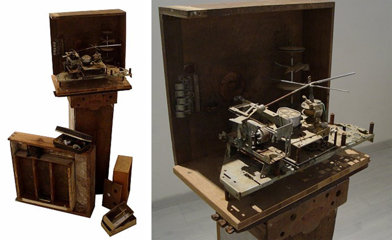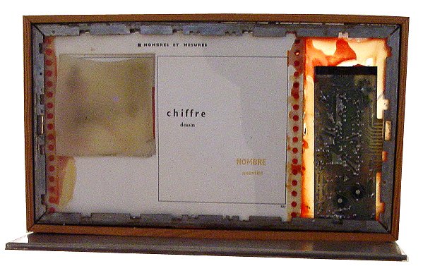Je suis parti, entre autres choses, de l’idée que « le grand verre » a souvent été décrit par ses regardeurs pour ses fonctionnements invisibles (mécanismes virtuels – décrits par l’auteur) - or je ne vois, je n’ai jamais rien vu d’autre qu’un ensemble d’objets figés sous verre. Un mécanisme arrêté qui fait gueule oser. |