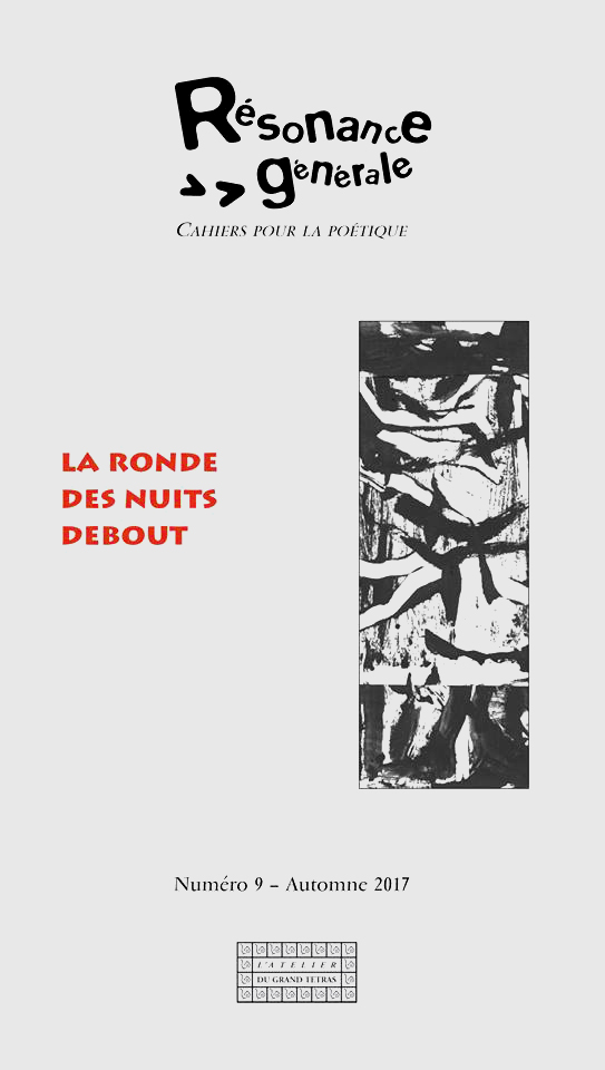 2017 - revue Résonnance Générale n° 9, "La ronde des nuits debout", illustrations (monotypes) de couverture et du poème "Du ciel au sol la parole" d''Alexis Hubert. |