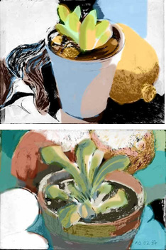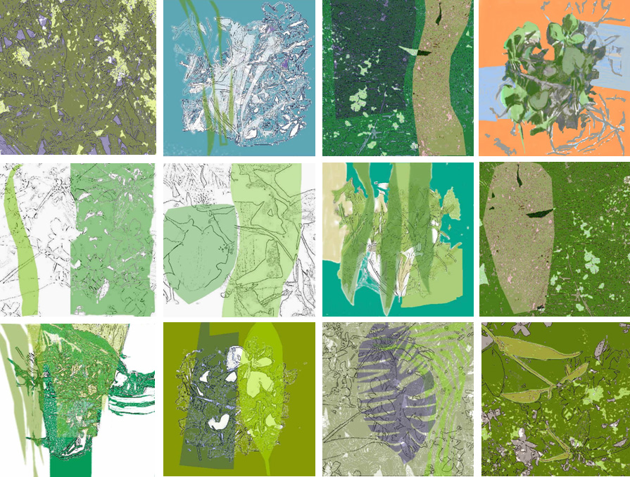 Clichés-verre colorisés (tirages numériques, maquette pour un textes de D. Faugeras) 12 x 12 cm chaque. 2001