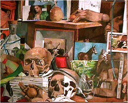 | "....J'ai toujours eu envie de travailler le thème des Vanités... Mais je ne voulais pas forcément raconter quelque chose ou faire une allégorie avec ça.!.. Je ne voulais pas non plus composer un motif exprès... Les deux cranes qui ont transité dans l'atelier entre 96 et 2001 n'ont été introduits au motif que tardivement, jusque là, je m'étais contenté de les représenter à part, comme je l'avais fait pour les pommes, les citrons, et d'autres objets soumis au travail de l'observation...[..] En fait, plutôt que de véritables Vanités, il s'agit d'associations (libres) d'objets, de formes et d'images qui se répondent ou émergent du chaos organisé (entretenu) du motif... Et puis ça m'amusait de commencer quelque part et de voir se faire ces rencontres au fur et à mesure que j'ajoutais un morceau de papier..." | ||||