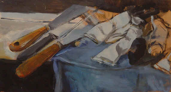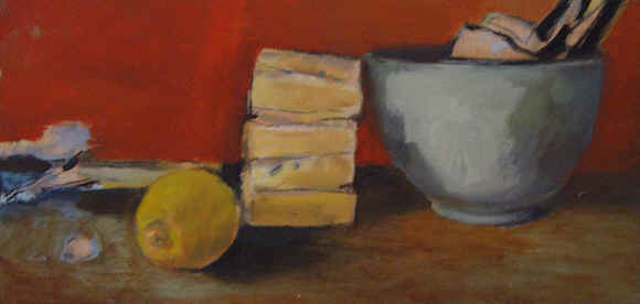 1990. Bol et citron. Huile sur bois. 15 x 35 cm. - 1990. Spatules et tubes. Huile sur bois. 15 x 35 cm.