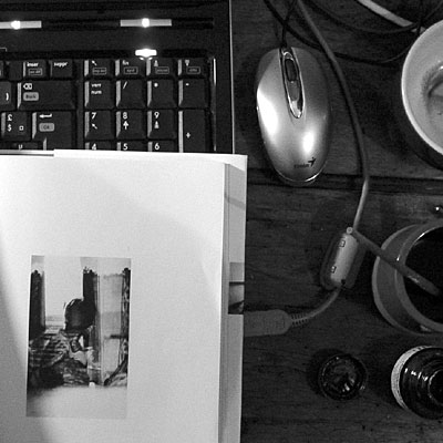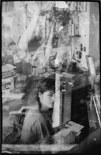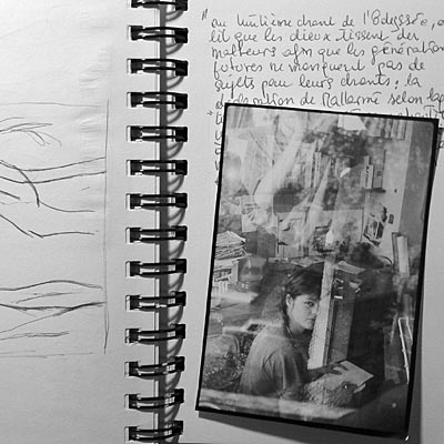 > notes sur clichés (photo revisitée) 27 /Une fenêtre fermée. Deux figures emboîtées. Une pièce dehors. Tout ça superposé sur quelques centimètres carrés. Pas moins, mais sûrement beaucoup plus ! Sur les masses noires se découpe la silhouette d'un buste de profil, sur lequel viennent se superposer les motifs d'une sorte d'escalier, des roches, la forme effilée d'arbres (des peupliers ?) et quelques fragments épars d'un motif ornemental suggérant une ferronnerie de grille. Dans ce qui semble être un parc (ou un jardin), une autre figure de profil, plus petite, vêtue d'une robe blanche, tenant à la main un livre, est assise sur un bloc de pierre. La masse sombre en contre-jour de la première figure semble être, littéralement, habitée par la seconde au point que le contour du visage de l'une se superpose à celui de l'autre. Confusion spatiale que seule une probable surimpression de prise de vue sur un même négatif (une même plaque ?) a pu rendre possible. Alchimie du hasard qui, mettant l'une dans l'autre, écrase la temporalité, ou plutôt rend tangible la profondeur temporelle, ici et là-bas étant soudain tout à l'heure et maintenant. L'accident photographique ici destructeur du sujet (des sujets) mais révélateur d'un laps et simultanément d'une histoire, même si c'est dans ces lacunes. J'ai retrouvé ces jours-ci, dans les pages d'un carnet, cette autre photographie, montrant Odile dans sa chambre de la citée universitaire à Aix en Provence vers 1986. Si l'effet (la superposition) semble les réunir, le motif photographié n'est pas du même ordre puisqu'il ne s'agissait ici que d'un simple jeu de vitre. |