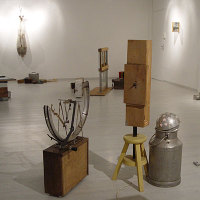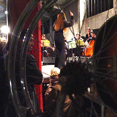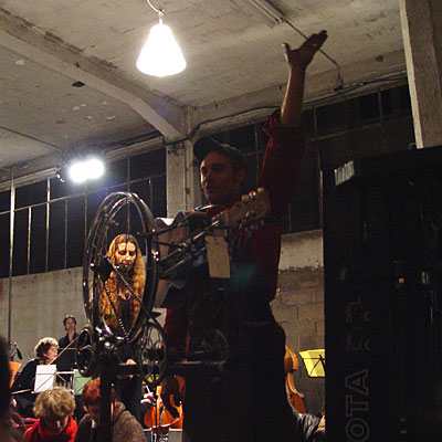 > notes sur clichés (photo revisitée) 37 / Il a retourné le vélo sur la pelouse. L'enfant se tient derrière comme un putti dans tondo. La roue avant tourne sous l'impulsion de la main du jeune homme, l'enfant lève la sienne pour toucher les rayons. Je repense (mais pour quelle raison ?) à cette sculpture que j'avais remis en état pour l'exposition " la rosée et l'arroseur creuse ". Et puis, surtout, je retrouve une série d'images faites cet automne à Besançon, lors du concert " la symphonie mécanique ". |