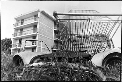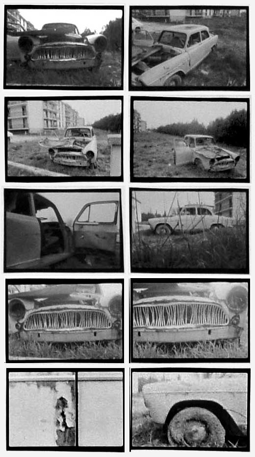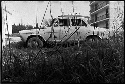 > notes sur clichés (photo revisitée) 70/ Une fois de plus, je ne saurais expliquer comment, mais il se trouve que la mémoire fait des nœuds inattendus. Comment et pourquoi cette petite image grise à peine lisible a-t-elle fait venir à mon esprit le mot d’Aronde. Je ne parle pas ici de la mortaise utilisée en menuiserie et joliment désignée par queue d’aronde, mais du nom du modèle de cette Simca née dans les années 50 et que mon grand père conduisait encore dans les années 70, bleue lavande avec un toit blanc, si mes souvenirs sont bons. Sur l’image il n’y a pourtant aucune voiture, juste un bâtiment blanc, faiblement élevé dont on distingue vaguement une enfilade de portes. Derrière la ligne tendue d’un toit en tôle dépassent des nuées sombres. Dans la partie basse de l’image, dans la zone voilée, on distingue la présence d’une personne. Je revois dans la cour de l’immeuble du « Cormoran B », l’alignement des petits garages avec leurs rideaux de fer, la silhouette frêle de mon grand père penché sur le capot de l’aronde, astiquant les chromes avec une peau de chamois, l’image renversée des immeubles et des platanes dans les flaques… Plus tard, à Aix en Provence, j’ai croisé une épave d’Aronde abandonné sur un parking, en bordure de la Cité Universitaire de Fenouillère. Echouée dans les hautes herbes on aurait dit la carcasse d’un animal. |
